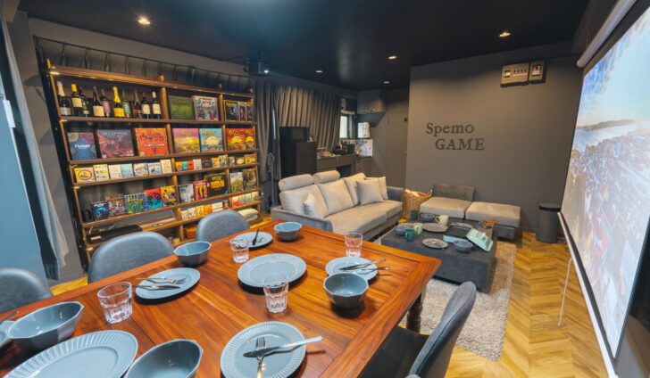 大迫力の100インチプロジェクター完備!映画鑑賞やスポーツ観戦も楽しめるスペモゲームの魅力。高級感溢れるスペモゲーム新宿御苑前で、ご友人やお仲間とボードゲームや料理会で特別な時間を過ごしてみませんか。