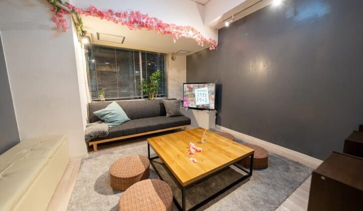 リニューアルで使いやすさ向上!ポップインアラジンとAladdin MIC(カラオケ)を新規導入。カウチソファとプロジェクターのメインとサブリビングに分かれ、女性や大人数での利用、撮影に最適です。
