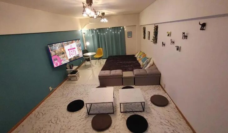 リニューアルで使いやすさ向上!ポップインアラジンとAladdin MIC(カラオケ)を新規導入。カウチソファとプロジェクターのメインとサブリビングに分かれ、女性や大人数での利用、撮影に最適です。