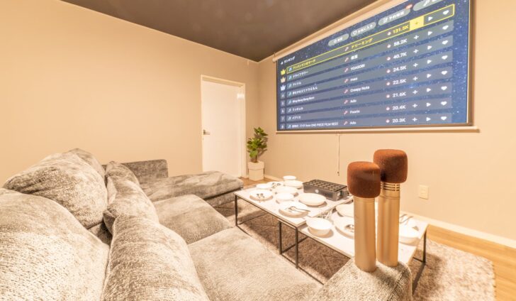 リニューアルで使いやすさ向上!ポップインアラジンとAladdin MIC(カラオケ)を新規導入。カウチソファとプロジェクターのメインとサブリビングに分かれ、女性や大人数での利用、撮影に最適です。