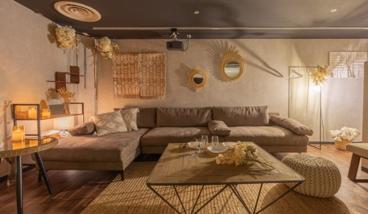 友達や恋人とまったりチルするのにおすすめ!ゆったり座れるソファに、大きなプロジェクターでドラマや映画鑑賞も!