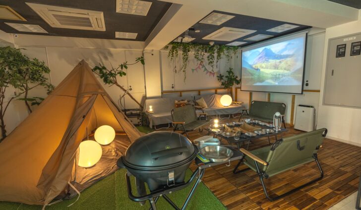 プロジェクターで映画を上映しながらBBQ!Campシリーズで特別なキャンプ時間を