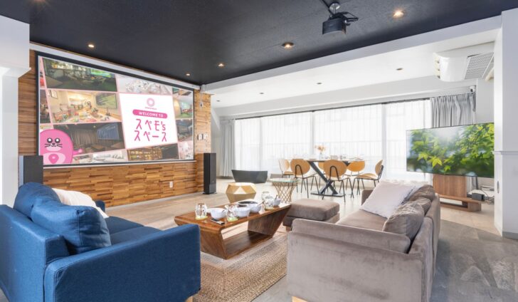 大画面プロジェクターでオフサイトミーティング、映画鑑賞やゲーム大会、キッチンを使ってたこ焼き器やフォンデュ鍋のお家デートにも!