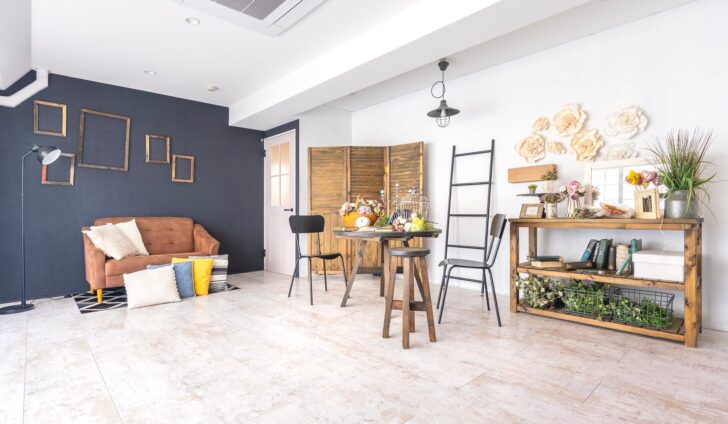 イギリス・ロンドンSTYLEのSNS映えインテリアコーディネート!「ロンドンSTYLEでSNS映えカフェ」をコンセプトに、コンクリート調のインダストリアルな壁紙に欧風の岩目調壁紙でシックに!